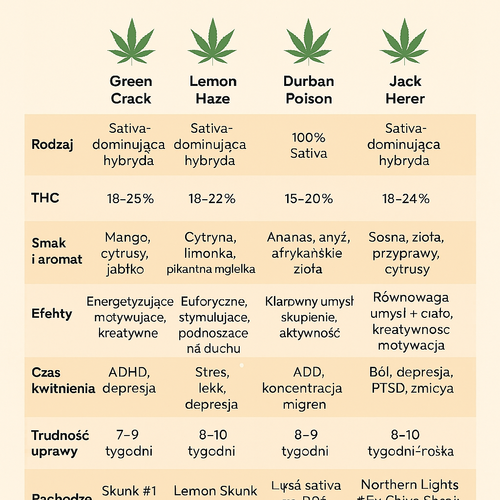 Porównanie: Green Crack vs Lemon Haze vs Durban Poison vs Jack Herer